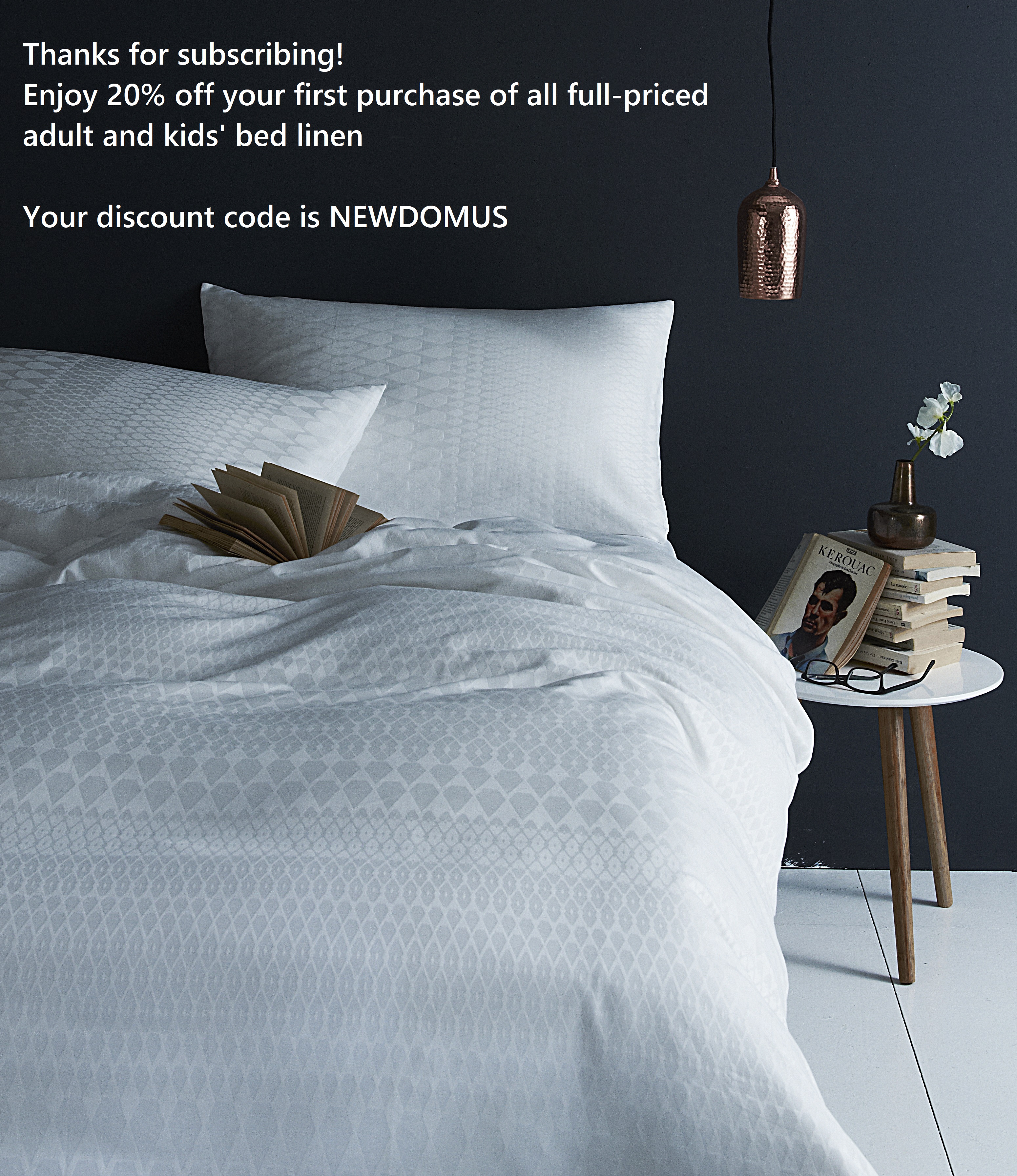 Available on your first purchase of all full-priced adult and kid's bed linen